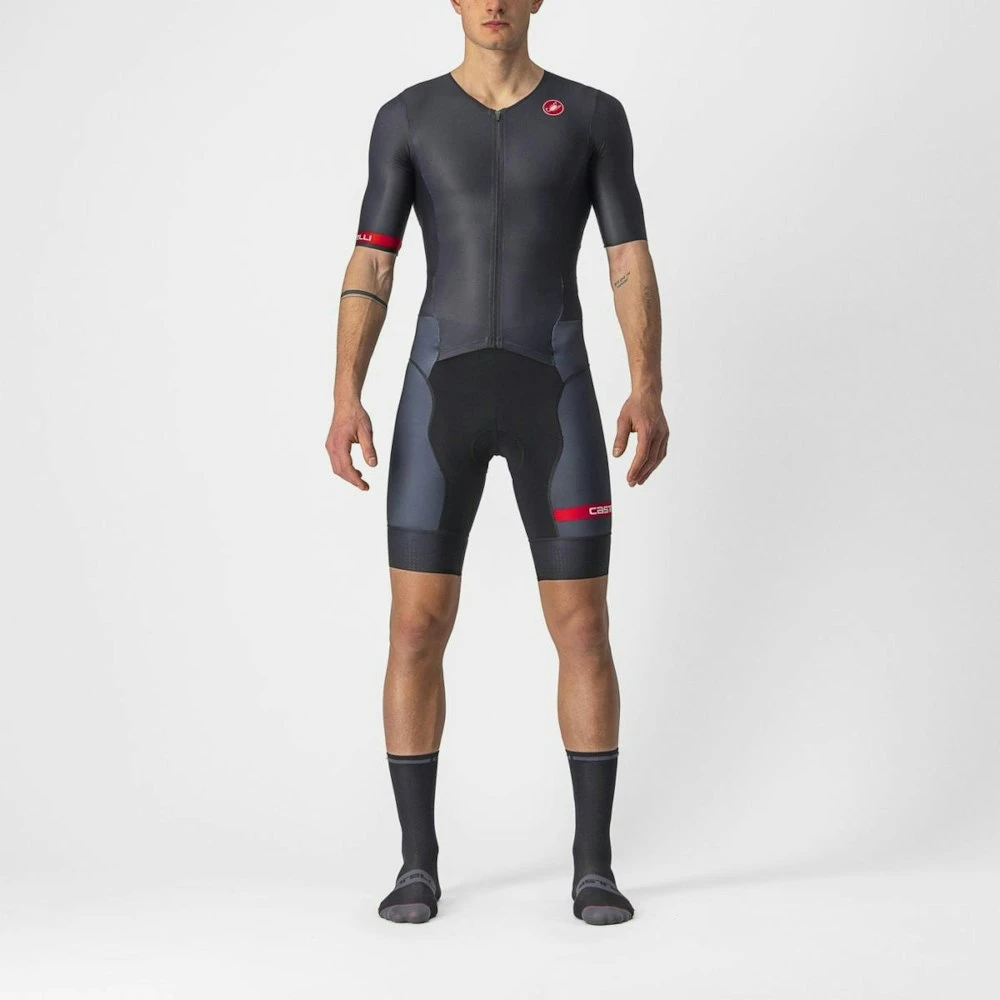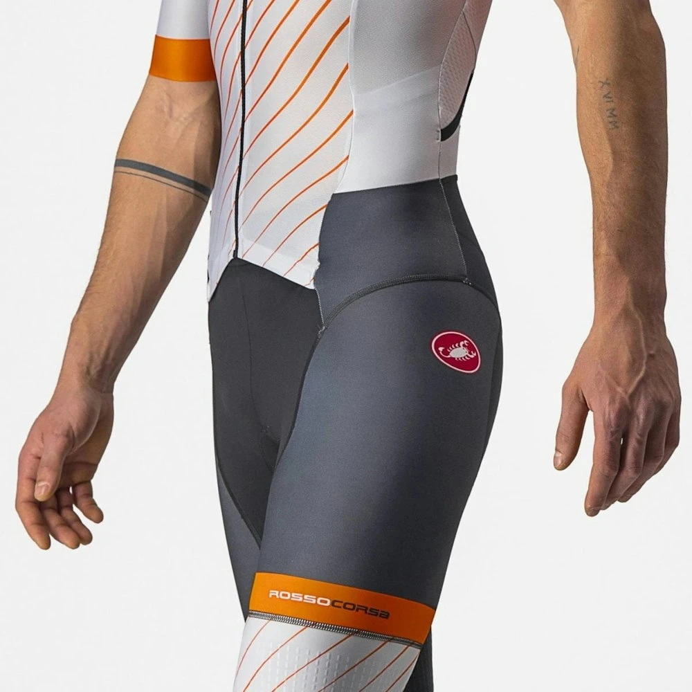Castelli’s Sanremo front opening makes it easier to bend for cycling and straighten out for the run and swim, while also allowing for easier nature breaks or opening up for extra-hot runs