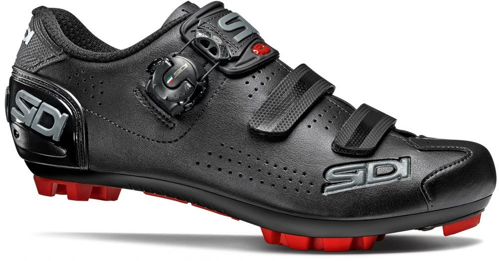 Carbon fiber-reinforced nylon sole with grippy plastic inserts and rubberized SIDI logo in the midsole area, for optimum traction in running passages and more safety when entering the pedal. Exchangeable thread inserts in the cleat area, additional inserts for optional studs. Compatible with all standard MTB pedal systems. Interchangeable profile insert in the toe area.
