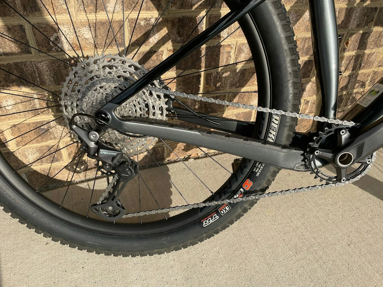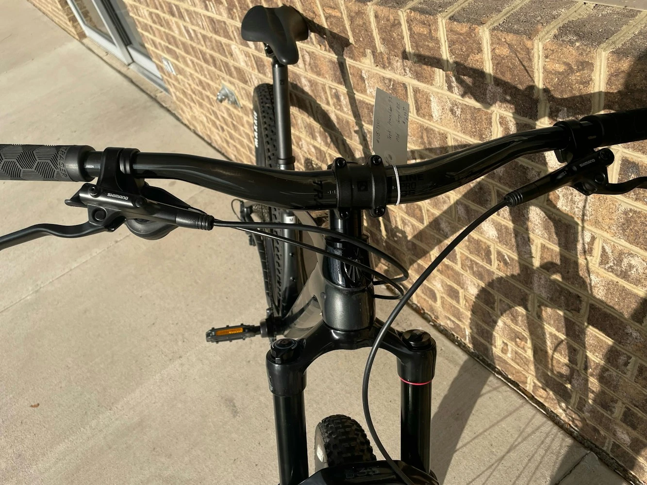 This bike has 27.5 wheels and a Rockshox 35 gold 27.5″. Also has a Bontrager carbon bar